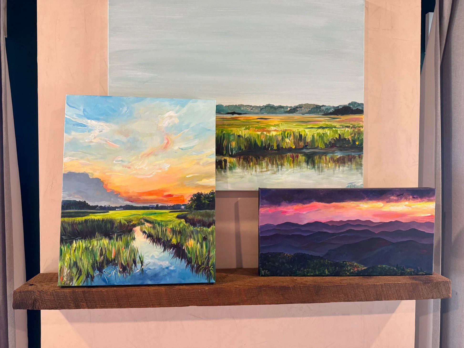 “Blue Ridge”, part of the Mountains to Sea collection is an original 12×24 acrylic painting on gallery wrapped canvas frame.