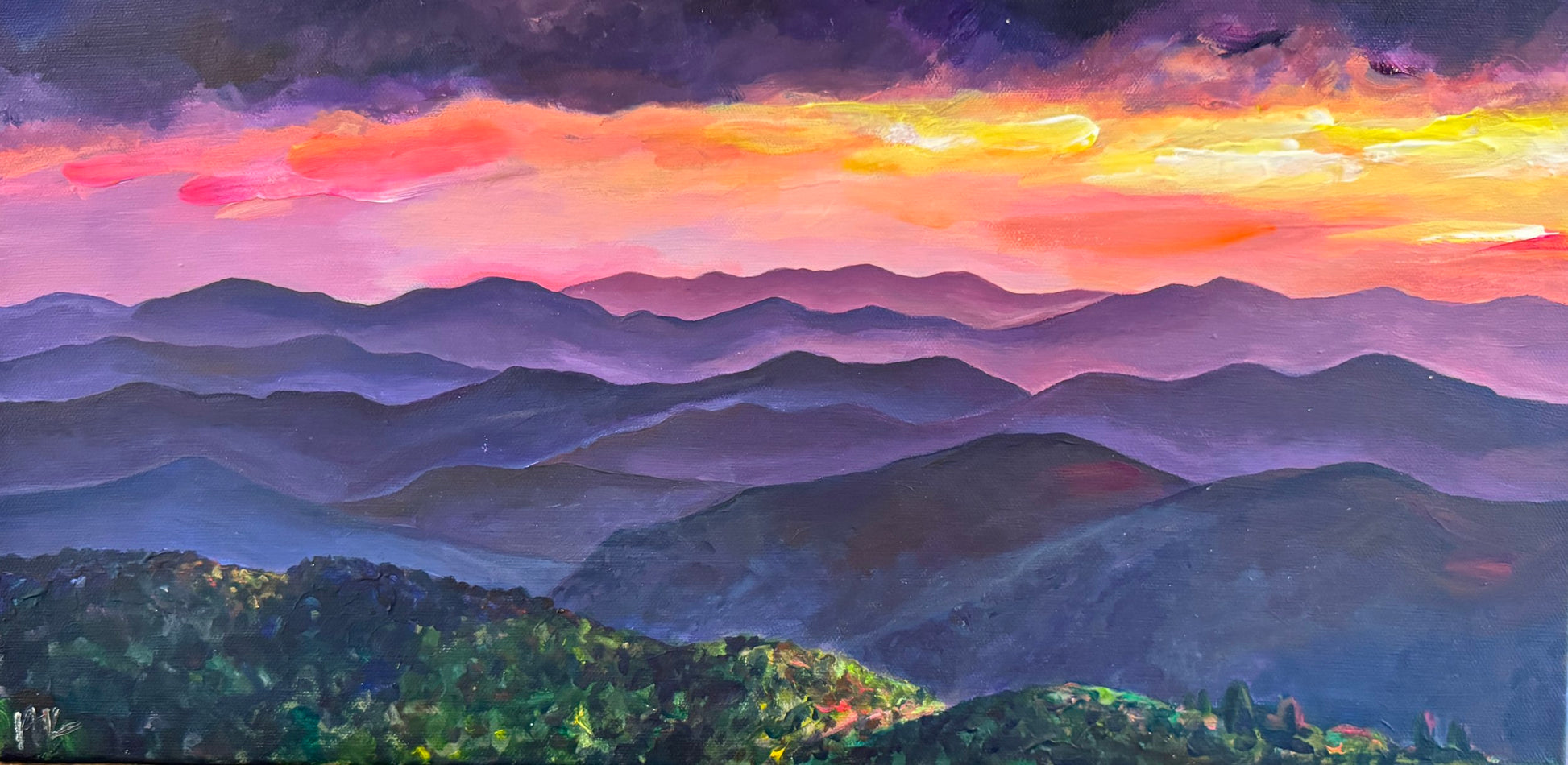My family and I have made our home in the beautiful Blue Ridge Mountains over the last decade and no matter how many times I see the blue mountain tops peek over the horizon as driving into town, they never cease to amaze me. The layered, gentle rolling mountains bring a peaceful presence to all. I hope this painting does the same for your space.